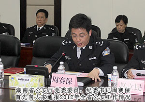 湖南省公安廳黨委委員、紀委書記周賽保首先向大家通報了2012年全省公安工作情況,他指出,剛剛過去的2012年,是公安工作任務艱巨繁重的一年。全省公安機關和廣大民警在省委、省政府和公安部的堅強領導下主動迎難而上,忠實履責,無私奉獻,有力地維護了全省社會政治穩(wěn)定和治安平穩(wěn)。根據(jù)民調(diào)中心調(diào)查顯示,2012年公眾對社會治安、公安隊伍建設的整體評價比2011年分別提升了2.196分、4.29分。警務調(diào)查顯示,人民群眾對警務工作的滿意率達98.94%,受到了省委、省政府和公安部的充分肯定。