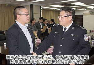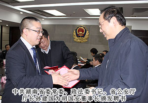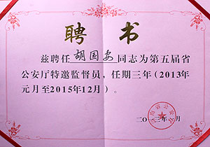 2013年3月26日下午,湖南省公安廳隆重舉行了第五屆特邀監(jiān)督員聘請儀式暨座談會。中共湖南省委常委、政法委書記、省公安廳廳長孫建國為省廳第五屆特邀監(jiān)督員頒發(fā)聘書并作重要講話;湖南省公安廳黨委副書記、常務副廳長胡旭曦,廳黨委委員、警令部主任趙立民,廳黨委委員、紀委書記周賽保,省公安廳經(jīng)偵總隊總隊長唐祥生,省交警總隊總隊長楊琪君等廳機關有關部門負責同志參加了座談會。會議宣讀了《湖南省公安廳關于聘請第五屆全省公安機關特邀監(jiān)督員的決定》。綠之韻集團董事長胡國安作為湖南省政協(xié)委員、優(yōu)秀企業(yè)家代表憑借多年對社會民生的關注,擔任社會職務積極履行職責的表現(xiàn),受聘為第五屆省公安廳特邀監(jiān)督員,成為31名監(jiān)督員中僅有的兩名省政協(xié)委員代表之一。