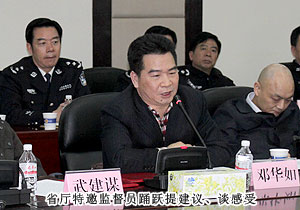 自1999年湖南省公安廳開展特邀監(jiān)督員工作以來已聘請五屆特邀監(jiān)督員。監(jiān)督員們通過學習掌握有關公安法律、法規(guī)和相關專業(yè)知識,深入公安機關明察暗訪;通過參加政風、行風、警風評議檢查等活動,主動向群眾宣傳公安政策法規(guī),將群眾的意見和要求及時反饋給公安機關,在民主監(jiān)督、參謀咨詢、宣傳引導等方面發(fā)揮了重要作用,有效提高了公安工作效能,轉變了公安隊伍工作作風。孫建國書記要求全省各級公安機關積極創(chuàng)造條件為各位特邀監(jiān)督員開展工作提供有力的支持,自覺接受特邀監(jiān)督員的監(jiān)督。開展中心工作、專項行動,要主動邀請?zhí)匮O(jiān)督員參加,組織他們開展多種形式的明查暗訪活動,充分發(fā)揮監(jiān)督員的監(jiān)督檢查作用,更好推動工作的開展,督促各項措施的落實。