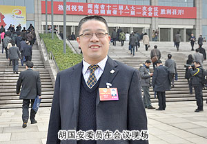 會(huì)議期間,省十一屆政協(xié)委員還集體列席了湖南省第十二屆人民代表大會(huì)第一次會(huì)議,會(huì)議由省委書(shū)記周強(qiáng)支持,省長(zhǎng)徐守盛代表省人民政府作工作報(bào)告。報(bào)告圍繞經(jīng)濟(jì)發(fā)展、兩型社會(huì)建設(shè)、民生事業(yè)改善等內(nèi)容,對(duì)過(guò)去5年進(jìn)行回顧,并就如何推動(dòng)經(jīng)濟(jì)持續(xù)健康發(fā)展、建設(shè)天藍(lán)地綠水凈湖南、為民辦實(shí)事等做出重要部署。此次報(bào)告中有三個(gè)關(guān)鍵點(diǎn):一是加快推進(jìn)新型城鎮(zhèn)化,二是建設(shè)天藍(lán)地綠水凈湖南,三是以創(chuàng)業(yè)帶動(dòng)就業(yè)。值得關(guān)注的是,報(bào)告中提及的這三點(diǎn)與胡國(guó)安委員在擔(dān)任第十屆委員期間提交的提案《關(guān)于全力促進(jìn)我省縣域經(jīng)濟(jì)發(fā)展的建議》和本次提交的兩份提案形成了完美的契合、達(dá)到高度的一致。在擔(dān)任第十屆省政協(xié)委員的五年時(shí)間里,胡國(guó)安委員始終圍繞我省“四化兩型”戰(zhàn)略,圍繞人民群眾最關(guān)心最直接最現(xiàn)實(shí)的利益問(wèn)題積極建言謀策,提交的提案《關(guān)于全力促進(jìn)我省縣域經(jīng)濟(jì)發(fā)展的建議》引起廣泛關(guān)注,被湖南衛(wèi)視、湖南經(jīng)視、《湘聲報(bào)》先后報(bào)道,并被評(píng)為“政協(xié)湖南省第十屆委員會(huì)優(yōu)秀委員”。此次,再次當(dāng)選省十一屆政協(xié)委員,胡國(guó)安委員經(jīng)過(guò)前期充分的考察調(diào)研,向大會(huì)組委會(huì)遞交了兩份提案《加強(qiáng)大氣污染防治工作,優(yōu)化我省環(huán)境質(zhì)量,大力推進(jìn)生態(tài)文明建設(shè)的建議和》、《提升全民創(chuàng)業(yè)質(zhì)量,建設(shè)創(chuàng)業(yè)創(chuàng)新型湖南的建議》,再次受到多家媒體的關(guān)注和與會(huì)委員的廣泛認(rèn)同。提案中,圍繞“生態(tài)湖南、綠色湖南”為出發(fā)點(diǎn),胡國(guó)安委員建議科學(xué)制定城市發(fā)展規(guī)劃,優(yōu)化城市區(qū)域功能和產(chǎn)業(yè)結(jié)構(gòu),著力打造瀏陽(yáng)河生態(tài)風(fēng)光帶,把瀏陽(yáng)河打造成湖南“賽納河”,加快建設(shè)天藍(lán)地綠水凈湖南。在民生事業(yè)改善方面,胡國(guó)安委員深入中小企業(yè)走訪調(diào)查,結(jié)合我省全民創(chuàng)業(yè)現(xiàn)狀,建議創(chuàng)造公平競(jìng)爭(zhēng)的創(chuàng)業(yè)就業(yè)政策環(huán)境,鼓勵(lì)青年自主創(chuàng)業(yè),以創(chuàng)業(yè)帶動(dòng)就業(yè),大力發(fā)展實(shí)體經(jīng)濟(jì),拓寬融資渠道,建立完善的社會(huì)化服務(wù)體系,提高中小企業(yè)市場(chǎng)競(jìng)爭(zhēng)力,全面提升我省全民創(chuàng)業(yè)質(zhì)量,促進(jìn)全省經(jīng)濟(jì)社會(huì)持續(xù)、健康發(fā)展。