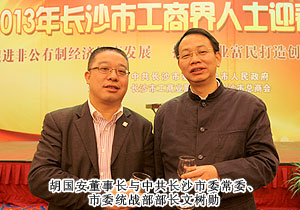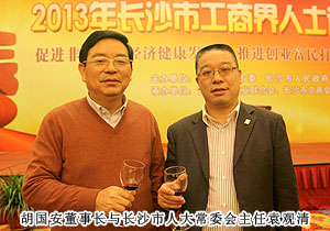 “話發(fā)展,謀未來,共迎新春佳節(jié)?!?013年1月23日,中共長沙市委、市政府舉行2013年長沙市工商界人士迎春酒會(huì)暨長沙市第四屆“優(yōu)秀中國特色社會(huì)主義事業(yè)建設(shè)者”頒獎(jiǎng)典禮。來自全市各行各業(yè)的600多名工商界人士歡聚一堂,共議長沙發(fā)展大計(jì)。中共長沙市委副書記、市長張劍飛,中共長沙市委副書記張迎龍,長沙市人大常委會(huì)主任袁觀清等領(lǐng)導(dǎo)出席迎春酒會(huì)。長沙市工商聯(lián)副主席、第三屆優(yōu)秀中國特色社會(huì)主義事業(yè)建設(shè)者、綠之韻集團(tuán)董事長胡國安主桌就座。