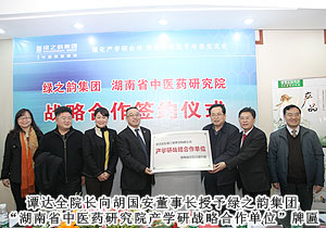 為更好地實現(xiàn)綠之韻第二個十年發(fā)展“大健康”產(chǎn)業(yè)規(guī)劃,2012年12月7日,綠之韻集團與湖南省中醫(yī)藥研究院、湖南中醫(yī)藥大學(xué)正式簽署戰(zhàn)略合作,決定在中醫(yī)藥健康產(chǎn)品研究開發(fā)、新品實驗、產(chǎn)品安全、綠之韻產(chǎn)品研發(fā)中心科研力量提升、專業(yè)人才引進等多個領(lǐng)域進行全面的戰(zhàn)略合作,持續(xù)加速產(chǎn)、學(xué)、研一體化格局。湖南省中醫(yī)藥大學(xué)黨委副書記、紀(jì)委書記、研究院黨委副書記秦裕輝,湖南省中醫(yī)藥研究院院長、黨委副書記、湖南中醫(yī)藥大學(xué)副校長譚達全,湖南省中藥研究所所長張水寒出席簽約儀式。在湖南中醫(yī)藥研究院領(lǐng)導(dǎo)、專家及湖南綠之韻保健日用品有限公司總工程師·產(chǎn)品研發(fā)專家譚雪軍等共同見證下,綠之韻集團董事長胡國安與湖南省中醫(yī)藥研究院院長、中醫(yī)藥大學(xué)副校長譚達全簽署戰(zhàn)略協(xié)議,并接受“湖南省中醫(yī)藥研究院產(chǎn)學(xué)研戰(zhàn)略合作單位”授牌,董事、常務(wù)副總裁勞嘉作“綠之韻未來十年健康產(chǎn)業(yè)方向與產(chǎn)業(yè)機會”報告,承諾將以專業(yè)、負責(zé)任的態(tài)度,打造“綠色湖南”健康品牌。