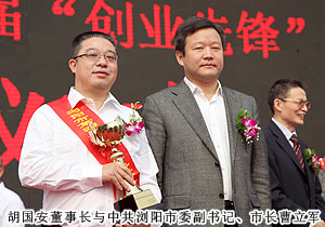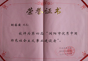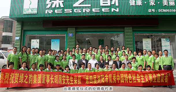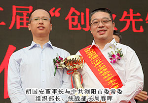 為表彰非公經(jīng)濟(jì)人士為瀏陽(yáng)市經(jīng)濟(jì)社會(huì)發(fā)展做出的重要貢獻(xiàn),2012年10月13日上午,瀏陽(yáng)市第四屆“優(yōu)秀中國(guó)特色社會(huì)主義事業(yè)建設(shè)者”頒獎(jiǎng)儀式在瀏陽(yáng)市政東廣場(chǎng)隆重舉行。中共瀏陽(yáng)市委副書記、市長(zhǎng)曹立軍,長(zhǎng)沙市政協(xié)副主席、市工商聯(lián)主席彭繼球等領(lǐng)導(dǎo)出席頒獎(jiǎng)儀式。會(huì)上,綠之韻集團(tuán)董事長(zhǎng)胡國(guó)安被中共瀏陽(yáng)市委、市政府授予第四屆“瀏陽(yáng)市優(yōu)秀中國(guó)特色社會(huì)主義事業(yè)建設(shè)者”榮譽(yù)稱號(hào)。