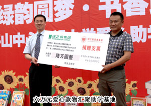 2012年6月25日,綠之韻黑龍江分公司“綠韻圓夢(mèng)?書香助學(xué)”活動(dòng)暨綠之韻平山中心小學(xué)愛心助學(xué)基地授牌儀式成功舉行。為了給渴望知識(shí)的孩子們創(chuàng)造更好的讀書環(huán)境,活動(dòng)當(dāng)天,綠之韻黑龍江地區(qū)近100名優(yōu)秀經(jīng)銷商將愛心圖書親手送到了學(xué)生手中,同時(shí),綠之韻集團(tuán)東北區(qū)域業(yè)務(wù)總監(jiān)李定代表綠之韻慈善基金向愛心助學(xué)基地捐贈(zèng)6萬元款物,標(biāo)志著綠之韻第二家校園愛心“流動(dòng)圖書館”正式成立。