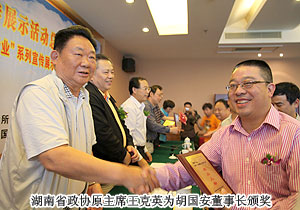 綠之韻集團(tuán)作為湖南省非公有制經(jīng)濟(jì)黨建工作優(yōu)秀典型企業(yè),憑借在積極引導(dǎo)非公經(jīng)濟(jì)融入“四化兩型”戰(zhàn)略方面取得的杰出貢獻(xiàn),經(jīng)各地、各部門和相關(guān)單位的積極推薦、評(píng)審,并經(jīng)《湖南日?qǐng)?bào)》公示,董事長胡國安被評(píng)為2011湖南省‘四化兩型’建設(shè)杰出人物。2011年兩會(huì)期間,湖南省優(yōu)秀政協(xié)委員胡國安在會(huì)議上作《積極引導(dǎo)非公有制經(jīng)濟(jì)融入“四化兩型”戰(zhàn)略的建議》的報(bào)告,該提案獲得中共湖南省委書記、省人大常委會(huì)主任周強(qiáng)的重要批示,被納為省經(jīng)信委重要研究課題。