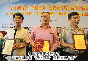 儀式上,王克英宣布宣傳活動(dòng)正式啟動(dòng),并和其他與會(huì)領(lǐng)導(dǎo)一起按動(dòng)水晶球,正式開啟2012湖南省“四化兩型”、“文化旅游”、“衛(wèi)生”、“銀行業(yè)”系列宣傳展示活動(dòng)序幕。會(huì)上,胡國安董事長代表所有獲獎(jiǎng)人員發(fā)言,他表示:獎(jiǎng)項(xiàng)的獲得是一種信任和支持,也是一份鼓勵(lì)和肯定,必將繼續(xù)秉承拼搏進(jìn)取、銳意創(chuàng)新的精神,加強(qiáng)企業(yè)黨建工作建設(shè),不斷提升非公企業(yè)黨建工作水平,切實(shí)組織企業(yè)黨團(tuán)員學(xué)習(xí)先進(jìn)、爭當(dāng)先進(jìn),同時(shí)積極引導(dǎo)非公有制經(jīng)濟(jì)融入“四化兩型”戰(zhàn)略,為實(shí)現(xiàn)我省經(jīng)濟(jì)社會(huì)又好又快、更好更快發(fā)展作出應(yīng)有的貢獻(xiàn)。