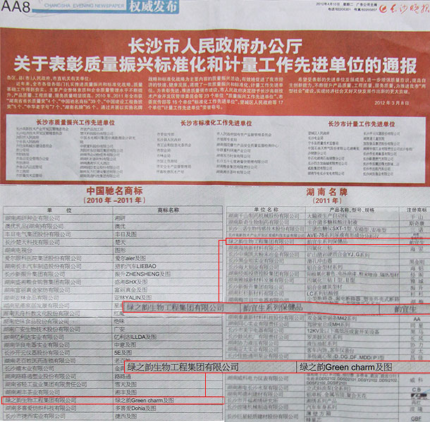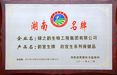 2012年4月10日,長沙市人民政府質(zhì)量工作會議成功召開。長沙市人民政府副市長何寄華,長沙市質(zhì)量監(jiān)督局局長陳曙光、副局長周笑春出席會議并發(fā)表重要講話。會上,綠之韻韻宜生系列產(chǎn)品榮獲“湖南名牌”榮譽稱號,是繼“韻宜生”商標榮獲“湖南省著名商標”后的又一重大榮譽。