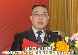 本次會議中,綠之韻集團(tuán)董事長胡國安代表長沙市工商聯(lián)參會企業(yè)家向廣大非公經(jīng)濟(jì)人士發(fā)出了《當(dāng)文明長沙企業(yè)家,做學(xué)習(xí)雷鋒排頭兵》倡議書。積極號召廣大民營企業(yè)家:學(xué)習(xí)雷鋒理想遠(yuǎn)大、信念堅(jiān)定,做一個(gè)忠誠于黨、熱愛人民的人;學(xué)習(xí)雷鋒刻苦鉆研、敬業(yè)奉獻(xiàn),做一個(gè)與時(shí)俱進(jìn)、愛崗敬業(yè)的人;學(xué)習(xí)雷鋒言行一致、誠信老實(shí),做一個(gè)誠實(shí)守信、求真務(wù)實(shí)的人;學(xué)習(xí)雷鋒勤儉節(jié)約、艱苦奮斗,做一個(gè)艱苦樸素、道德高尚的人。