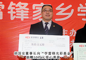 2012年2月29日,在“3?5”學(xué)習(xí)雷鋒紀(jì)念日即將到來之際,由湖南省工商聯(lián)、長沙市工商聯(lián)共同發(fā)起的“雷鋒家鄉(xiāng)學(xué)雷鋒、民營企業(yè)當(dāng)先鋒”——省會工商界人士學(xué)雷鋒慶三八大會在長沙楓林賓館拉開帷幕,吹響了湖南省會工商界爭當(dāng)學(xué)雷鋒先鋒的集結(jié)號。中共長沙市委副書記、市長張劍飛,中共長沙市委常委、市委統(tǒng)戰(zhàn)部部長文樹勛出席會議。會上,湖南省工商聯(lián)(總商會)常委、長沙市工商聯(lián)(總商會)副會長、優(yōu)秀民營企業(yè)家、綠之韻集團(tuán)董事長胡國安代表綠之韻慈善基金以實(shí)際行動為湖南省光彩事業(yè)增光添彩,向“學(xué)雷鋒光彩基金”捐贈50萬元愛心善款。