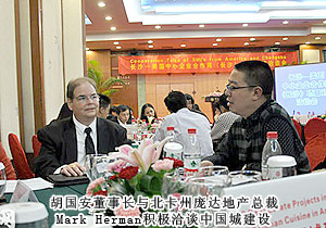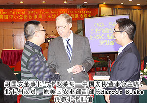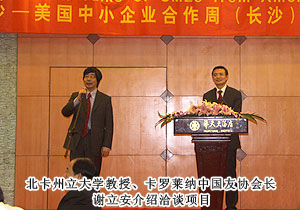 為落實(shí)周強(qiáng)書記在北京出席中美州長對(duì)話會(huì)議關(guān)于“開創(chuàng)中美省州地方合作新未來”的精神,推進(jìn)湖南與北卡州簽訂的友好省州協(xié)議內(nèi)容,促進(jìn)湖南與北卡州全面開展民間經(jīng)濟(jì)外交,2011年10月20日下午,長沙—美國中小企業(yè)合作周(長沙)項(xiàng)目對(duì)接洽談會(huì)在華天大酒店召開,由卡羅萊納—中國友協(xié)董事會(huì)主席,北卡州議員,原美國農(nóng)業(yè)部副部長Harris Blake為團(tuán)長率領(lǐng)的美國北卡經(jīng)貿(mào)及友好交流訪問團(tuán)成員來長與長沙企業(yè)家對(duì)接洽談。長沙市政協(xié)副主席、市工商聯(lián)主席彭繼球,市僑聯(lián)副主席翁少蘭等領(lǐng)導(dǎo)出席了對(duì)接洽談。繼九月訪美赴北卡州考察與美方企業(yè)有過初步對(duì)接后,此次綠之韻集團(tuán)胡國安董事長再次應(yīng)邀出席合作洽談會(huì)并對(duì)北卡州龐達(dá)地產(chǎn)總裁Mark Herman想建第一座中國城的項(xiàng)目積極關(guān)注。