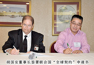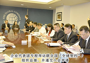 考察過程中,企業(yè)家代表團(tuán)一行專程拜訪了聯(lián)合國“全球契約”組織總部,與聯(lián)合國“全球契約”總干事喬治?科爾進(jìn)行了友好、親切的會見。綠之韻集團(tuán)、楚天科技、佳樂實(shí)業(yè)等湖南省15家民營企業(yè)現(xiàn)場向該組織遞交了入會申請?!叭蚱跫s”是一種思路和價值觀,由前聯(lián)合國秘書長安南首倡議,潘基文秘書長繼續(xù)推動。該契約旨在鼓勵全球企業(yè)與聯(lián)合國機(jī)構(gòu)、勞工組織和民間團(tuán)體一起,共同尋找克服全球化負(fù)面影響的途徑。加入該組織的單位必須在遵守人權(quán)、勞動標(biāo)準(zhǔn)、環(huán)境保護(hù)等方面率先垂范。