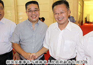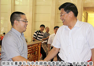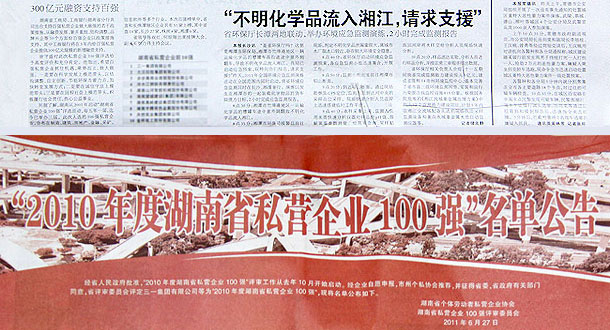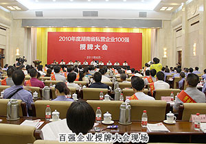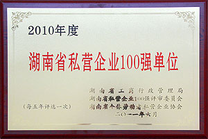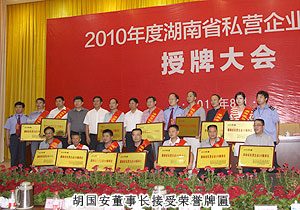 2011年8月16日,湖南省私營企業(yè)100強授牌大會在長沙隆重舉行。中共湖南省委副書記、省長徐守盛、中國個體勞動者協(xié)會會長甘國屏、省人民政府副省長劉力偉、湖南省人大常委會副主任陳叔紅、湖南省政協(xié)副主席、省工商聯(lián)會長何報翔等省市領(lǐng)導(dǎo)出席頒獎儀式。綠之韻集團作為湖南省重點企業(yè),榮耀晉升“2010年度湖南省私營企業(yè)100強”行列,胡國安董事長應(yīng)邀出席頒獎儀式,得到了省市各級領(lǐng)導(dǎo)的肯定和贊許。