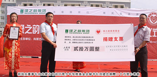 2011年7月20日,位于內(nèi)蒙古自治區(qū)烏蘭察布市的四子王旗熱鬧非凡--綠之韻四子王旗希望小學(xué)在此舉行隆重的捐贈儀式。內(nèi)蒙古自治區(qū)青少年發(fā)展基金會秘書長劉建忠、四子王旗旗委、常務(wù)副旗長蔚代青、政協(xié)副主席于有升、四子王旗工商局局長董明、副局長賈晉峰等政府領(lǐng)導(dǎo)及各界媒體嘉賓蒞臨,綠之韻集團(tuán)董事長胡國安、執(zhí)行總經(jīng)理龔振、綠之韻慈善基金總執(zhí)行戴曉彥不遠(yuǎn)萬里趕赴捐贈現(xiàn)場,內(nèi)蒙古分公司經(jīng)理候立新、內(nèi)蒙古地區(qū)愛心大使代表王連坤、郝建兵、張聞英以及2000余名綠之韻愛心大使參與愛心傳遞。