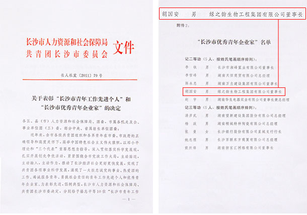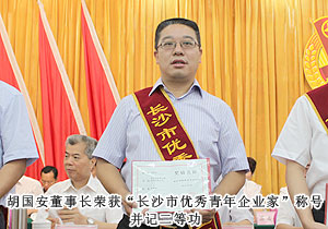 會(huì)上,為表彰先進(jìn),倡樹典型,長(zhǎng)沙市人民政府隆重表彰了“長(zhǎng)沙市優(yōu)秀青年企業(yè)家”、“長(zhǎng)沙市青年工作先進(jìn)個(gè)人”共20人。胡國(guó)安董事長(zhǎng)自2010年11月被評(píng)為“湖南省優(yōu)秀青年企業(yè)家”并記一等功以來,緊緊圍繞全省黨政工作大局,深入貫徹落實(shí)科學(xué)發(fā)展觀,扎實(shí)開展創(chuàng)先爭(zhēng)優(yōu)活動(dòng),主動(dòng)貼近,主動(dòng)融入,主動(dòng)作為,積極為湖南省經(jīng)濟(jì)的發(fā)展貢獻(xiàn)力量。此次表彰中,胡國(guó)安董事長(zhǎng)榮獲“長(zhǎng)沙市優(yōu)秀青年企業(yè)家”稱號(hào),并記二等功。