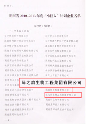 依據(jù)《中華人民共和國中小企業(yè)促進法》,并進一步貫徹落實湖南省委、省政府確定的工業(yè)強省戰(zhàn)略,推進“四千工程”和“兩型”社會建設(shè)的要求,近日,湖南省經(jīng)濟和信息化委員會隆重公布了湖南省“小巨人”計劃和“創(chuàng)業(yè)”計劃企業(yè)名單,在長沙市直屬33家“小巨人”計劃企業(yè)中,綠之韻集團榜上有名。