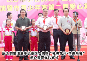 為慶祝“六一”國際兒童節(jié)的到來,2011年5月28日,由長沙市委組織部、市委宣傳部、市文明辦、團市委、市少工委、市教育局聯(lián)合舉辦的“杜鵑花開?情滿星城”小杜鵑藝術(shù)團慶“六一”文藝義演暨市青少年宮第二屆愛心集市大型公益活動,在長沙市青少年宮舉行。各級政府領(lǐng)導(dǎo)以及社會各界的1000多名愛心人士與全市各區(qū)縣(市)近200名殘疾兒童、孤兒、困難家庭子女、農(nóng)村留守兒童、農(nóng)民工子女共同慶祝屬于孩子們的歡樂節(jié)日。綠之韻集團董事長胡國安作為長沙市優(yōu)秀青年企業(yè)家代表受邀出席活動,并榮獲“杜鵑花開?情滿星城”愛心集市標兵榮譽獎牌。