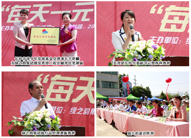 感恩五月,綠之韻人用實際行動再一次傳遞愛心。2011年5月18日,綠之韻集團(tuán)“激情五月 夢想嘉年華”活動現(xiàn)場,綠之韻慈善基金“每天一元”的慈善倡議活動得到了社會各界、集團(tuán)領(lǐng)導(dǎo)、綠之韻員工、經(jīng)銷商的熱情參與。共青團(tuán)長沙市委副書記詹萍萍、長沙市青少年發(fā)展基會理事長羊舒麟、長沙國家生物產(chǎn)業(yè)基地管委會副主任陳志高、綠之韻集團(tuán)董事長胡國安、董事常務(wù)副總裁勞嘉、女性健康產(chǎn)業(yè)事業(yè)部總裁譚正、低碳產(chǎn)業(yè)事業(yè)部副總裁兼市場總經(jīng)理張晉崧等集團(tuán)及各事業(yè)部的領(lǐng)導(dǎo)出席本次活動,并在現(xiàn)場積極捐款,傳遞愛心。