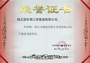 2011年“3?15”國際保護消費者權(quán)益日之際,中國保護消費者基金會根據(jù)《消費者權(quán)益保護法》所賦予的職能和職責(zé),以“誠信、維權(quán)”為年度消費主題而組織的“全國市場放心消費單位”評比活動揭榜。綠之韻集團認真貫徹執(zhí)行《消費者權(quán)益保護法》、《產(chǎn)品質(zhì)量法》,嚴格按照國家的行業(yè)規(guī)定與質(zhì)量標準組織生產(chǎn),經(jīng)過活動組織方及國家相關(guān)部門的層層審查,被中國保護消費者基金會授予“全國市場放心消費單位”。