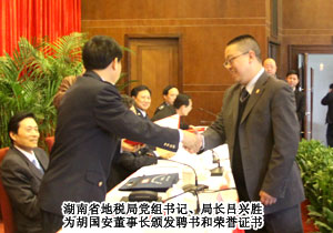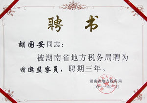 自2008年受聘湖南地稅局特邀監(jiān)查員以來(lái),胡國(guó)安董事長(zhǎng)認(rèn)真履行職責(zé),了解和反映基層稅務(wù)部門和稅務(wù)人員依法治稅、依法行政的情況,在解決群眾關(guān)心的熱點(diǎn)難點(diǎn)問(wèn)題,促進(jìn)行風(fēng)政風(fēng)建設(shè)方面取得了良好的效果,得到了地稅系統(tǒng)領(lǐng)導(dǎo)的一致好評(píng)。此次會(huì)議,胡國(guó)安董事長(zhǎng)成唯一受聘連任湖南省地稅特邀監(jiān)察員的企業(yè)家。省地稅局黨組書記、局長(zhǎng)呂興勝親自頒發(fā)了聘書和榮譽(yù)證書,并勉勵(lì)胡國(guó)安董事長(zhǎng)認(rèn)真履行職責(zé),積極開展工作,進(jìn)一步加大監(jiān)督力度,為我省黨風(fēng)廉政建設(shè)、優(yōu)化經(jīng)濟(jì)發(fā)展環(huán)境作貢獻(xiàn)。