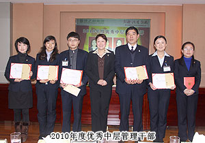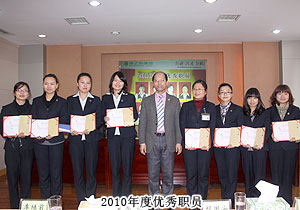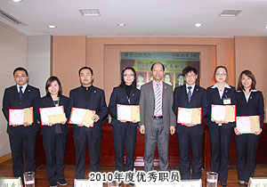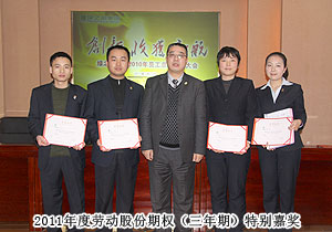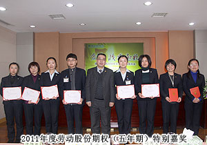 頒獎典禮中,四季度服務(wù)明星、優(yōu)秀服務(wù)集體、年度優(yōu)秀職員、年度優(yōu)秀中層管理干部的表彰讓每一個員工感受到榮譽(yù)背后的忠誠、敬業(yè)和專業(yè)。本次頒獎,一份得來不易的殊榮更讓員工們?yōu)閾碛芯G之韻的事業(yè)平臺而驕傲,為表彰鼓勵一直兢兢業(yè)業(yè),勤勤懇懇,愛司如家,對公司發(fā)展做出突出貢獻(xiàn)的優(yōu)秀員工,集團(tuán)特頒勞動股份期權(quán)獎。本次共有八名優(yōu)秀職員獲2011年度勞動股份期權(quán)(五年期)特別嘉獎,四名優(yōu)秀職員獲2011年度勞動股份期權(quán)(三年期)特別嘉獎。胡國安董事長親自為他們頒獎,并在總結(jié)發(fā)言中表示:或許你現(xiàn)在還離優(yōu)秀差一步,但只要你們再努力,勇敢地向優(yōu)秀邁進(jìn),所有表現(xiàn)優(yōu)秀的職員都能在今后的努力中獲此殊榮。同時,胡國安董事長清晰地為員工們規(guī)劃職業(yè)生涯,讓綠之韻的每一位員工都能將才能最大化、價值最大化。