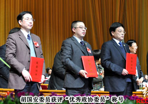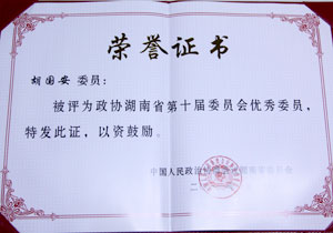 根據(jù)《關(guān)于湖南省政協(xié)委員履行職責(zé)的辦法(試行)》“在每一屆政協(xié)的第三、第五年,按照委員總數(shù)的8%評選優(yōu)秀政協(xié)委員”的要求,省政協(xié)將在年底評選優(yōu)秀省政協(xié)委員。優(yōu)秀省政協(xié)委員評選條件為:積極主動參加政協(xié)活動,并在其中起骨干作用;履行職責(zé)成果顯著,建言獻策轉(zhuǎn)化率高;為地方經(jīng)濟社會發(fā)展作出的貢獻較大。評選采取量化的辦法,依據(jù)政協(xié)職能和委員職責(zé),設(shè)置了參加政協(xié)例會情況、撰寫提案及辦理情況、社情民意采用及轉(zhuǎn)化情況、參加調(diào)研情況等9個計分項目。擔(dān)任政協(xié)委員期間,胡國安委員先后提交了《我省民企應(yīng)對金融危機的對策及建議》《關(guān)于下調(diào)武廣高鐵票價》等多份關(guān)系經(jīng)濟發(fā)展及社會民生的提案,并多次深入一線調(diào)研,實實在在了解民眾,及時提出建議,最終獲評“優(yōu)秀政協(xié)委員”榮譽稱號。湖南衛(wèi)視、湖南經(jīng)視、紅網(wǎng)、《瀟湘晨報》《長沙晚報》《人民政協(xié)報》等多家權(quán)威媒體對胡國安委員的先進事跡進行了報道!