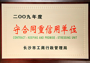 2010年11月3日,長沙市守合同重信用活動總結(jié)暨合同監(jiān)管工作會議在綠之韻集團總部會議室召開,長沙市工商行政管理局副局長謝朝暉、合同處處長李曉紅等領(lǐng)導(dǎo)出席會議。會上,謝朝暉局長為綠之韻集團頒發(fā)2009年長沙市“守合同重信用單位”榮譽牌匾。