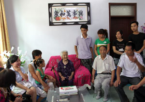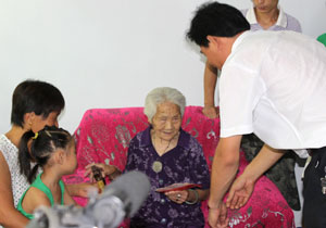 經(jīng)葉縣D8358店李增偉經(jīng)理多次奔走聯(lián)系,2010年8月13日,綠之韻尋找百位百歲老人活動小組聯(lián)合葉縣縣委宣傳部、葉縣電視臺一起對葉縣遵化店鎮(zhèn)代莊村95歲的張梅老人進行了慰問,在送上公司誠摯祝福的同時,也將慰問金和公司健康產(chǎn)品銀杏螺旋藻禮盒裝送到老人手里。