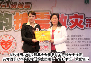 執(zhí)行總經(jīng)理龔振致捐款倡議書,向下屬公司、全國(guó)各地分公司、全國(guó)加盟專賣店及分銷員發(fā)出募捐倡議,號(hào)召全體綠之韻人向?yàn)?zāi)區(qū)人民伸出援助之手,為災(zāi)區(qū)送上一份愛心,點(diǎn)燃一份希望。會(huì)上,羊舒麟秘書長(zhǎng)代表共青團(tuán)長(zhǎng)沙市委向綠之韻集團(tuán)頒發(fā)“愛心單位”榮譽(yù)證書,勞嘉副總接受榮譽(yù)證書并表示:奉獻(xiàn)愛心,扶危濟(jì)困,綠之韻長(zhǎng)久以來(lái)的經(jīng)營(yíng)理念永遠(yuǎn)離不開“回饋”二字,在綠之韻人的共同努力下,相信我們用愛心匯聚的暖陽(yáng),一定能驅(qū)散災(zāi)難的陰霾!