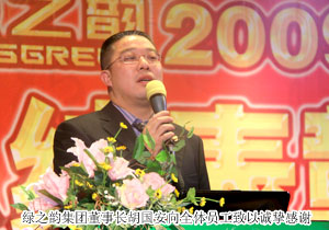 綠之韻集團執(zhí)行總經(jīng)理龔振、董事常務副總經(jīng)理勞嘉、市場總監(jiān)諶獻軍在會上對2009年的工作作了總結(jié)并提出2010年工作的整體規(guī)劃。董事長胡國安作全年總結(jié)及來年展望的重要發(fā)言,就2009年度所取得的成績向全體員工表示誠摯的謝意,并向大家致以新年的問候。號召全體員工在觀念、戰(zhàn)略、人力資源、技術和管理方面繼續(xù)創(chuàng)新,自強不息,勤奮拼搏,把握新一年的機遇,實現(xiàn)更大的跨越和發(fā)展。