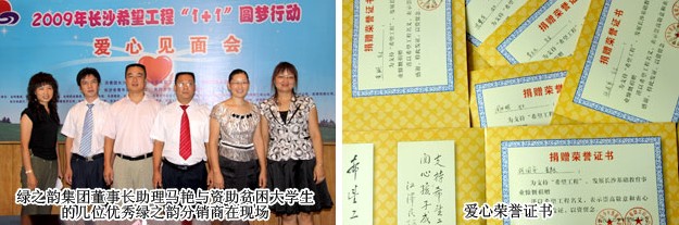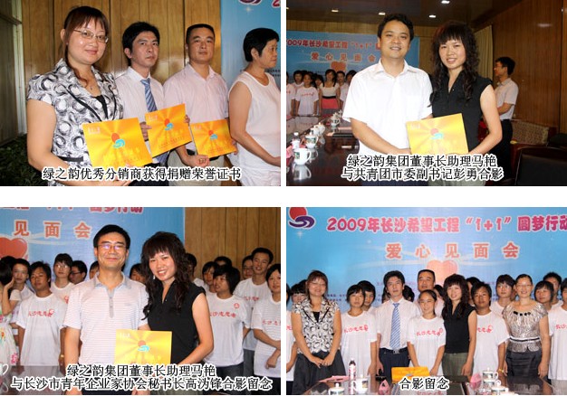 8月28日,湖南省長(zhǎng)沙市青少年宮內(nèi)洋溢著濃濃的愛(ài)心——在綠之韻慈善基金及綠之韻湖南分公司的組織下,以大學(xué)生影響小學(xué)生“綠之韻樹(shù)人行動(dòng)”全國(guó)第三站暨共青團(tuán)長(zhǎng)沙市委“2009長(zhǎng)沙希望工程圓夢(mèng)行動(dòng)”愛(ài)心見(jiàn)面會(huì)在此舉行。共青團(tuán)長(zhǎng)沙市委副書(shū)記彭勇、長(zhǎng)沙市青年企業(yè)家協(xié)會(huì)秘書(shū)長(zhǎng)高溈鋒、長(zhǎng)沙市青年聯(lián)合會(huì)副秘書(shū)長(zhǎng)楊溶、長(zhǎng)沙市青少年發(fā)展基金會(huì)副秘書(shū)長(zhǎng)羊舒麟等領(lǐng)導(dǎo),以及綠之韻集團(tuán)董事長(zhǎng)助理、慈善基金秘書(shū)長(zhǎng)馬艷、綠之韻愛(ài)心分銷(xiāo)商張建軍、黃翔、周書(shū)明、沈慧芳、李正元出席會(huì)議并捐贈(zèng)愛(ài)心款項(xiàng)。此次行動(dòng)以“一幫幾”的結(jié)對(duì)幫扶形式向近200名貧困準(zhǔn)大學(xué)生發(fā)放55萬(wàn)元助學(xué)款,用愛(ài)心托起了他們的大學(xué)夢(mèng)。綠之韻集團(tuán)利用樹(shù)人行動(dòng)的愛(ài)心力量共幫扶了七名考上清華、北大等名校卻無(wú)力承擔(dān)學(xué)費(fèi)的寒門(mén)學(xué)子。
