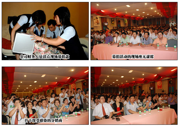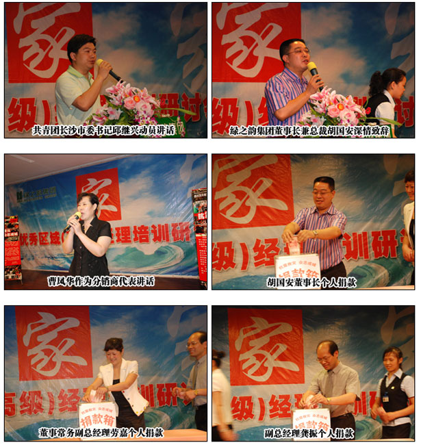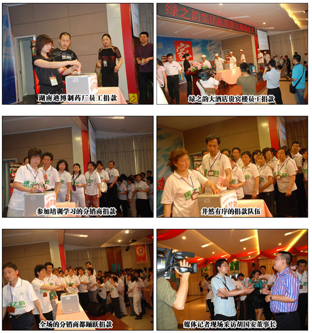 而綠之韻集團總部通過共青團長沙市委、長沙市青年企業(yè)家協(xié)會的聯(lián)絡(luò)與長沙市青少年發(fā)展基金會、長沙市血液中心組織現(xiàn)場捐款和義務(wù)獻血活動。17日下午13點30分,綠之韻“眾志成城 抗震救災(zāi)”活動在綠之韻集團中國總部舉行,共青團長沙市委副書記、長沙市青年企業(yè)家協(xié)會常務(wù)副會長彭勇、長沙市青年企業(yè)家協(xié)會秘書長王海軍也蒞臨現(xiàn)場。隨后,由綠之韻集團董事長兼總裁胡國安向共青團長沙市委捐款100萬元現(xiàn)金及物資,而正在公司參加培訓(xùn)學(xué)習(xí)的200余名分銷商、湖南綠之韻迪博制藥廠員工、綠之韻國際大酒店貴賓樓員工以及公司總部員工井然有序地排隊向災(zāi)區(qū)捐款,現(xiàn)場募集現(xiàn)金138888元,共青團長沙市委當(dāng)即將1138888元現(xiàn)金及物資轉(zhuǎn)交給長沙市青少年發(fā)展基金會。湖南電視臺、長沙電視臺、星辰在線網(wǎng)站等媒體記者對胡國安董事長進行了現(xiàn)場采訪,胡總說:“萬涓成水,匯愛成海。在中華民族遭遇災(zāi)難的時刻,只要我們?nèi)f眾一心,眾志成城,共負國難,共渡難關(guān),我們就一定能贏得抗震救災(zāi)的最后勝利,一定能夠幫助災(zāi)區(qū)人民重建美好的家園!”