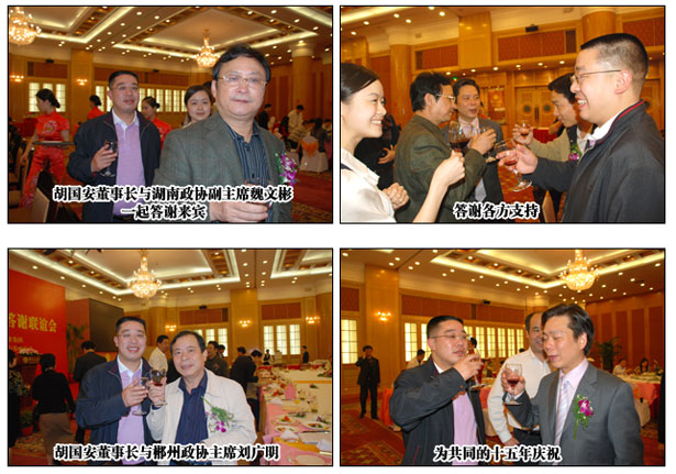 2008年4月21日,由政協(xié)湖南省委主辦的湖南黨政權(quán)威機(jī)關(guān)報《湘聲報》更名擴(kuò)版十五周年答謝聯(lián)誼會在湖南長沙華天大酒店隆重舉行。湖南政協(xié)副主席陽寶華、湖南政協(xié)副主席、湖南廣播影視集團(tuán)董事長魏文彬以及各地市政協(xié)領(lǐng)導(dǎo)、社會各界代表紛紛到場表示祝賀。綠之韻集團(tuán)董事長兼總裁胡國安先生作為《湘聲報》的特別顧問、名譽(yù)主編也應(yīng)邀出席了此次聯(lián)誼會,并發(fā)表重要講話。