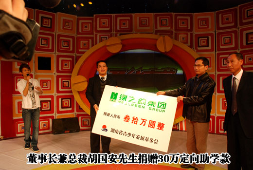 該節(jié)目聯(lián)合愛心企業(yè)籌集善款為貧困山區(qū)捐贈(zèng)希望小學(xué)的欄目宗旨正與綠之韻集團(tuán)公司愛心助學(xué)的理念不謀而合,引起了集團(tuán)公司領(lǐng)導(dǎo)的關(guān)注,并最終促成了此次的合作,這也是該欄目首次推出湖南省外的希望小學(xué)捐贈(zèng)活動(dòng)。綠之韻集團(tuán)董事長兼總裁胡國安親臨節(jié)目現(xiàn)場將30萬元現(xiàn)金支票捐贈(zèng)到湖南省青少年發(fā)展基金會(huì)副秘書長李秋林以及孟憲臣校長手中。胡總說:“捐贈(zèng)38所綠之韻希望學(xué)校是所有綠之韻人的追求,三年以來,集團(tuán)公司投入在慈善公益方面的款項(xiàng)累計(jì)已達(dá)500多萬,在以后的日子里,我們?nèi)詫⒉粩嗟臑楦黜?xiàng)社會(huì)公益活動(dòng)奉獻(xiàn)愛心,幫助更多需要幫助的人,在勇往直前的事業(yè)發(fā)展途中,讓愛見證每一位綠之韻人的情懷。