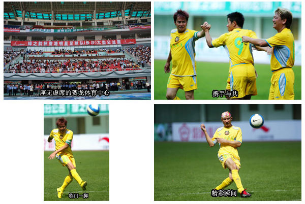 2007年5月20日下午3點,星城長沙因為遠道而來的香港明星足球隊和來自全國各地的綠之韻精英顯得更加光輝燦爛。為歡慶四周年慶典,綠之韻集團公司與香港明星足球隊攜手的“綠之韻杯善行2007三湘助學行”香港明星足球隊(長沙)大型公益賽”在賀龍體育中心隆重進行。這是一場由共青團湖南省委、湖南省體育局指導,湖南省青少年發(fā)展基金會主辦、綠之韻集團全程支持的以助學為宗旨,以推動我省農村青年文化扶貧計劃為主旋律的大型公益活動。湖南省人大常委會副主任王四連女士、共青團湖南省委副書記張值恒先生為本次賽事致辭,共青團湖南省委副書記陳雪楚、湖南省文化廳廳長金則恭、湖南省體育局副局長熊倪、湖南省青少年發(fā)展基金會理事長李克勛、中共長沙市委常委、市政府常務副市長向力力、長沙市人大副主任張菊平 、長沙市政府副市長曹亞等政府領導也親臨球賽現(xiàn)場。慈善與體育的水乳交融,明星與精英的交相輝映,讓整個賽場呈現(xiàn)出令人振奮的萬千姿彩。綠茵場上,這場在善行的大旗下,以愛心的名義舉行的公益足球賽,由湖南省青少年發(fā)展基金會理事長李克勛先生和綠之韻集團董事長胡國安先生共同為比賽開球。香港明星足球隊與綠之韻善行聯(lián)隊的對抗精彩紛呈。譚詠麟、陳百強、黃日華、羅家英等明星在球場上同樣風采照人?;盍λ纳涞淖闱驅氊愋恪①愂轮袌鱿愀壑栊亲篌?、影星羅家英和炙手可熱的超女唐笑等相繼一展美妙歌喉的精彩表演讓現(xiàn)場觀眾熱情高漲