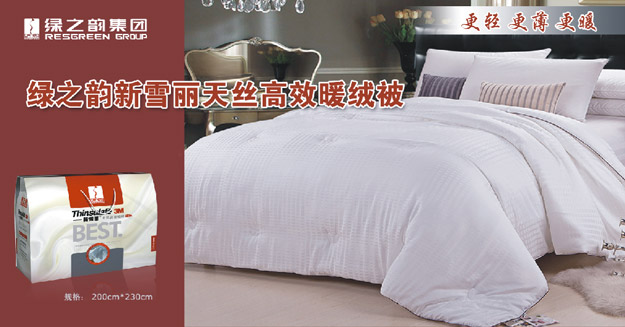 綠之韻集團與世界500強企業(yè)3M公司強強聯(lián)手推出高科技被芯——綠之韻新雪麗天絲高效暖絨被。此款被芯使用的是市場上熱重效率最高的合成保溫材料,利用被芯形成具有高吸附空氣性能的空間結(jié)構(gòu),從而阻止人體熱量通過空氣對流散失,同時反射回大部分的人體熱輻射,這樣就保障了人體熱量盡可能少的損失。且3M公司的新雪麗保溫材料就是為了可以承受地球上最苛刻的環(huán)境條件才研制出來的,因此從它誕生起就比一般的保溫材料更保暖。實驗證明,在相同重量的情況下,要多550克羽絨作為填充料,才能達到這樣一款新雪麗暖絨被的保暖效果,這也直接解決冬天蓋被臃腫的難題。