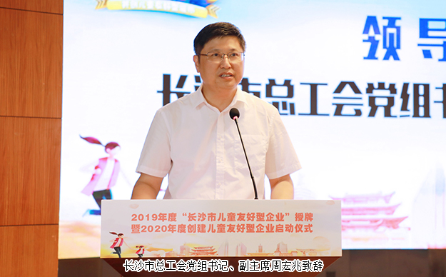 活動(dòng)伊始,長(zhǎng)沙市總工會(huì)黨組書(shū)記、副主席周宏兆致辭。他首先代表長(zhǎng)沙市總工會(huì)向各位領(lǐng)導(dǎo)、來(lái)賓的蒞臨表示歡迎,并向全市青少年兒童致以節(jié)日的問(wèn)候。他表示,2019年,長(zhǎng)沙市自然資源和規(guī)劃局、市教育局、市婦聯(lián)聯(lián)合出臺(tái)《長(zhǎng)沙市創(chuàng)建“兒童友好型城市”三年行動(dòng)計(jì)劃(2018-2020年)》,圍繞政策友好、空間友好、服務(wù)友好三個(gè)方面,推出創(chuàng)建兒童友好型城市十大行動(dòng)、42項(xiàng)任務(wù),努力保障少年兒童在星城長(zhǎng)沙健康快樂(lè)茁壯成長(zhǎng)。這其中涌現(xiàn)出了一批長(zhǎng)期致力于服務(wù)兒童、關(guān)心關(guān)愛(ài)職工子女,積極開(kāi)展扶貧助學(xué)、保障兒童權(quán)利的企業(yè)。他向首批獲得“兒童友好型企業(yè)”稱(chēng)號(hào)的企業(yè)代表們予以祝賀,希望獲獎(jiǎng)企業(yè)能繼續(xù)服務(wù)好職工子女,積極參與公益事業(yè),為長(zhǎng)沙市兒童友好型城市建設(shè)貢獻(xiàn)出企業(yè)力量。