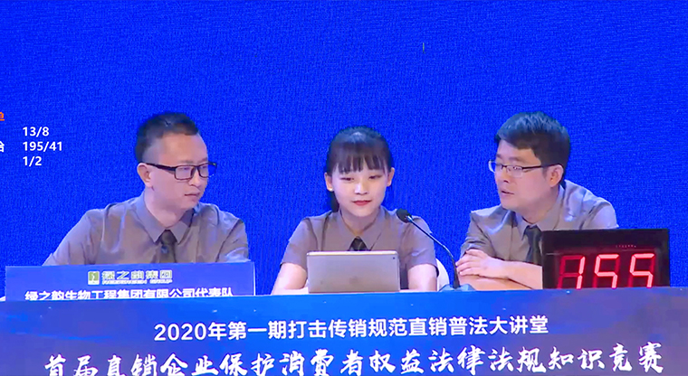 8月20日,根據(jù)國(guó)家市場(chǎng)監(jiān)督管理總局工作安排,由國(guó)家市場(chǎng)監(jiān)督管理總局規(guī)范直銷與打擊傳銷辦公室指導(dǎo)、中國(guó)消費(fèi)者報(bào)社承辦、重慶市市場(chǎng)監(jiān)督管理局協(xié)辦的2020年首期打傳規(guī)直普法大講堂宣傳活動(dòng)在重慶召開(kāi)。綠之韻集團(tuán)受邀參加本次會(huì)議,并組建知識(shí)競(jìng)賽代表隊(duì)參與“直銷企業(yè)保護(hù)消費(fèi)者權(quán)益法律法規(guī)知識(shí)競(jìng)賽”環(huán)節(jié),與其他 8 家直銷企業(yè)代表隊(duì)同臺(tái)競(jìng)技,展示行業(yè)整體積極風(fēng)貌。