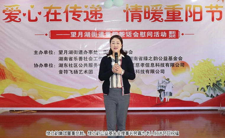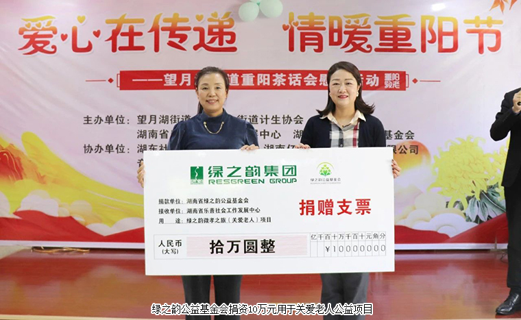 歲歲重陽,今又重陽。為進一步弘揚敬老孝親的文明德尚之風,2020年10月24日,綠之韻集團董事總裁、綠之韻公益基金會理事長勞嘉,綠之韻集團黨委書記、綠之韻公益基金會副理事長劉云帶領愛心志愿者參加在長沙舉行的重陽節(jié)主題茶話會慰問活動。會上,勞嘉理事長代表綠之韻公益基金會捐資10萬元用于關愛老人公益項目,為獨居老人、重疾高齡老人、計生特殊家庭和貧困家庭送去一份節(jié)日的溫暖。