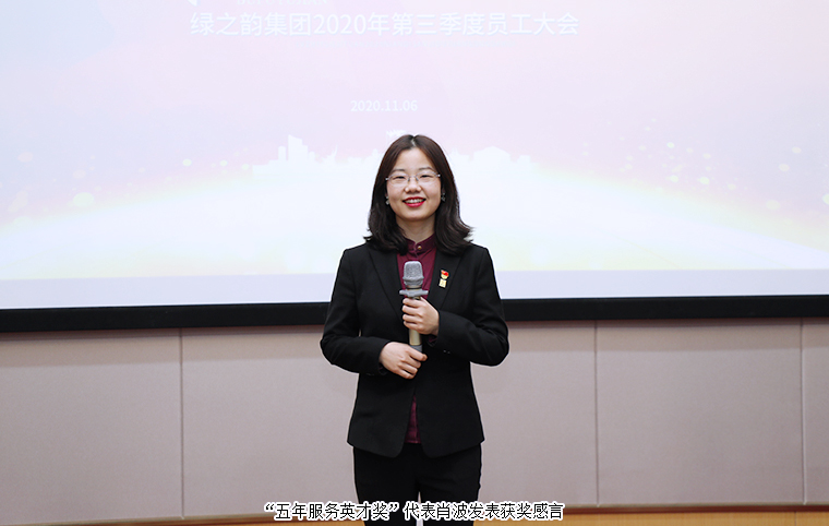 11月6日,綠之韻集團2020年第三季度員工大會暨五年服務英才獎、十年服務忠誠獎頒發(fā)儀式成功舉行。綠之韻集團董事長胡國安、董事總裁勞嘉攜集團高管及全體員工參加會議。