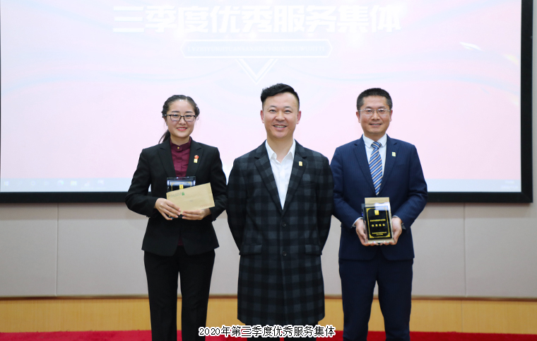 為表彰先進、凝聚力量,進一步激勵全體員工的積極性和奮斗激情,大會集中頒發(fā)了“三季度優(yōu)秀服務集體”“三季度服務明星”“五年服務英才獎”“十年服務忠誠獎”等獎項。傭金結算中心、新聞信息中心榮獲“2020年第三季度優(yōu)秀服務集體”稱號,喻鳴鸞、靳威、楊邢軒、李向宇、王雪、牛小紅、戴明玉、林智文、李思、夏丹、劉偉、李克戰(zhàn)、戴明勇、蘇銅、肖巧林被評為“2020年第三季度星級優(yōu)秀員工”,綠之韻集團副總裁劉淑娟、總經理劉維利為獲獎部門代表及個人頒獎。肖波、曾夢繁、朱麗妍、張婭、蘇妍、陳苗、張煜軒、劉博、吳冬梅、李星麗、牛小紅、孟慶玲、袁新星、張琳、鄧金林、劉伏海榮膺“五年服務英才獎”,張曉芳、周金霖、盛夏、高素丹、彭姣、高芳榮膺“十年服務忠誠獎”,綠之韻集團董事總裁勞嘉、副總裁胡均安先后上臺為獲獎員工頒發(fā)獎章與榮譽證書,并致以熱烈祝賀。“五年服務英才獎”代表肖波和“十年服務忠誠獎”代表周金霖分別發(fā)表獲獎感言。