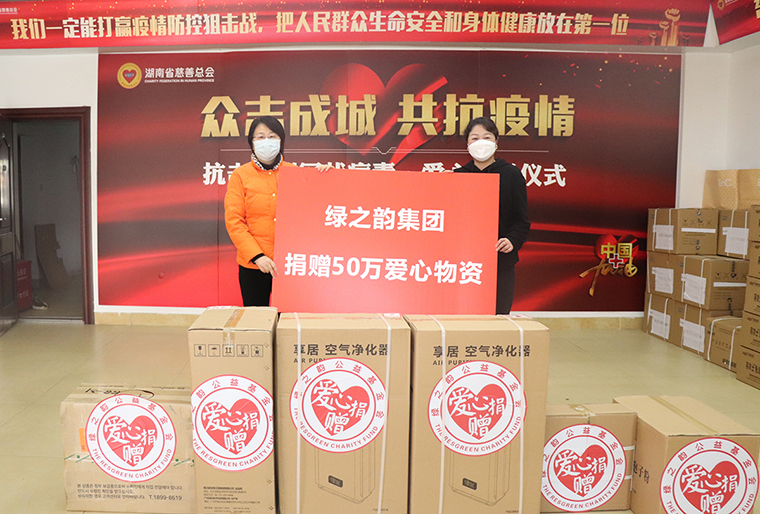 2020年2月13日,綠之韻公益基金會向湖南省慈善總會捐贈價值50萬元愛心物資,包括:空氣凈化器30臺、醫(yī)用酒精消毒液750瓶、韓國KF口罩1000只、KN90口罩2000只、銀離子抗菌液500瓶、銀離子免洗手消毒液512瓶、螺旋藻300瓶和靈芝孢子粉300盒。