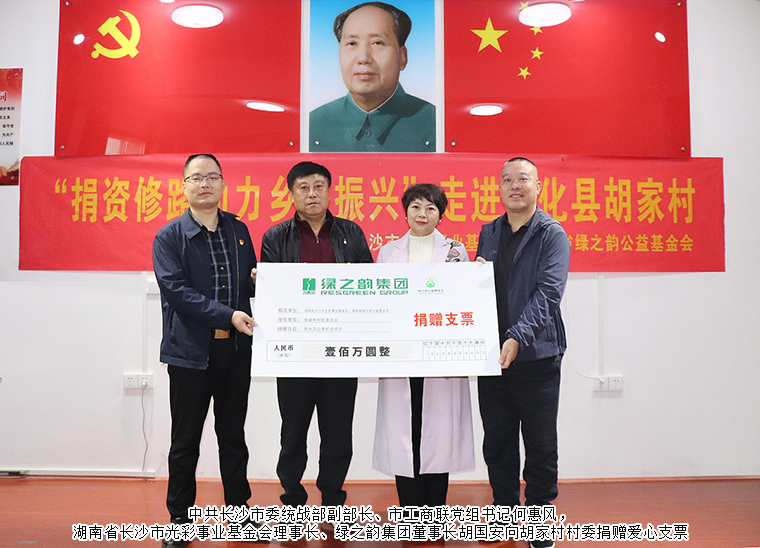 捐贈儀式由益陽市安化縣政協(xié)副主席、縣工商聯(lián)主席李艷云主持?;顒右潦?,中共益陽市委統(tǒng)戰(zhàn)部副部長、市工商聯(lián)黨組書記陳孟球致辭。他在講話中對胡國安董事長作為非公經(jīng)濟人士代表,響應(yīng)統(tǒng)一戰(zhàn)線助力鄉(xiāng)村振興號召,堅定“聽黨話、跟黨走”的政治信仰和致富思源、不忘回報家鄉(xiāng)的濃厚情懷,表示了高度的肯定與贊許。未來,市工商聯(lián)將以此活動為契機,充分發(fā)動異地商協(xié)會組織,投身“萬企興萬村”行動,團結(jié)引領(lǐng)民營經(jīng)濟人士,為大力實施“三高四新”戰(zhàn)略,奮力譜寫山鄉(xiāng)巨變,全面建設(shè)現(xiàn)代化新益陽貢獻統(tǒng)戰(zhàn)力量。隨后,中共長沙市委統(tǒng)戰(zhàn)部副部長、市工商聯(lián)黨組書記何惠風(fēng),湖南省長沙市光彩事業(yè)基金會理事長、綠之韻集團董事長胡國安向胡家村村委捐贈100萬元愛心支票。中共安化縣冷市鎮(zhèn)黨委書記方平、胡家村村支部書記胡利民分別向湖南省長沙市光彩事業(yè)基金會理事長胡國安和綠之韻公益基金會理事胡均安回贈愛心牌匾。
