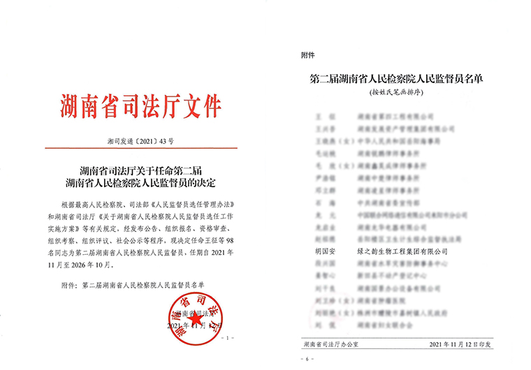 會上,湖南省司法廳黨組成員、政治部主任雷豐超宣讀了任命決定。綠之韻集團董事長胡國安等九十八名同志被任命為第二屆湖南省人民檢察院人民監(jiān)督員,任期自2021年11月至2026年10月。會議為第二屆湖南省人民檢察院人民監(jiān)督員頒發(fā)聘書,全體人民監(jiān)督員進行宣誓。