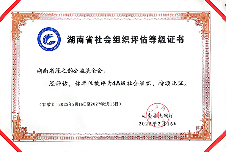 2022年3月9日,湖南省社會組織等級評估授牌大會在長沙召開。根據(jù)民政部《社會組織評估管理辦法》、《湖南省社會組織評估管理辦法》有關規(guī)定,社會組織等級評估從基礎條件、內(nèi)部治理、工作績效、黨建工作和社會評價五個方面對申報單位進行綜合考評,經(jīng)專家組實地考察、現(xiàn)場交流、意見反饋、資料核查、網(wǎng)上公示等程序,最終確定評估等級。湖南省綠之韻公益基金會獲評“4A級社會組織”。