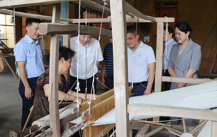 調(diào)研組一行首先來到卓然原鄉(xiāng)染坊就非遺傳承保護(hù)、文旅融合發(fā)展等工作進(jìn)行考察,深入了解了原鄉(xiāng)染坊目前的經(jīng)營情況。原鄉(xiāng)染坊作為北盛鎮(zhèn)撈刀河畔·田園綜合體項目的旅游休閑項目,其織布、染色都是采用“古法”操作,即紡織女工們用木制紡車紡出一匹匹夏布后,染色師傅們再用從卓然村收購的荷花、荷葉、蓮蓬以及其他植物中提煉的染料給布匹著色。目前,染坊兼具生產(chǎn)、研學(xué)、文創(chuàng)三大功能,同時圍繞染坊延伸建造生態(tài)染織物種植基地、織染學(xué)院、織染博物館等文化新生態(tài)。