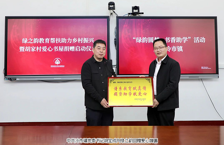 為積極響應湖南省“民企興縣 跨越同行”助力鄉(xiāng)村振興重點幫扶縣專項行動,2023年3月31日,綠之韻集團通過湖南省綠之韻公益基金會“書香助學項目”捐贈100萬元愛心款項,用于安化縣冷市鎮(zhèn)胡家村愛心書屋建設及在安化大橋學校設立“綠韻圓夢獎學金”,支持鄉(xiāng)村振興文化建設和教育事業(yè)發(fā)展。