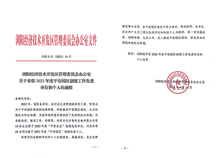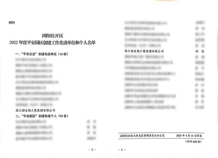 瀏陽經(jīng)開區(qū)黨工委委員、管委會副主任、企業(yè)黨委書記何六生宣讀《關(guān)于表彰2022年度安全生產(chǎn)工作先進(jìn)單位和先進(jìn)個人的通知》,綠之韻集團(tuán)被授予“2022年度平安企業(yè)創(chuàng)建先進(jìn)單位”稱號,綠之韻集團(tuán)工會主席馮紅獲得“平安園區(qū)創(chuàng)建先進(jìn)個人”榮譽。