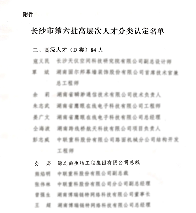 根據(jù)《長(zhǎng)沙市建設(shè)創(chuàng)新創(chuàng)業(yè)人才高地的若干措施》有關(guān)精神,按照中共長(zhǎng)沙市委人才工作領(lǐng)導(dǎo)小組《長(zhǎng)沙市高層次人才分類(lèi)認(rèn)定實(shí)施辦法(試行)》、《2019年度長(zhǎng)沙市高層次人才分類(lèi)認(rèn)定目錄》和《長(zhǎng)沙市移動(dòng)互聯(lián)網(wǎng)企業(yè)高層次人才分類(lèi)認(rèn)定目錄》的有關(guān)要求,經(jīng)用人單位自主申報(bào)、各區(qū)縣(市)和園區(qū)初審、市委人才辦復(fù)審,報(bào)市委人才工作領(lǐng)導(dǎo)小組審定,確定了長(zhǎng)沙市第六批高層次人才分類(lèi)認(rèn)定名單,綠之韻生物工程集團(tuán)有限公司(以下簡(jiǎn)稱(chēng)“綠之韻”)董事、總裁勞嘉女士成功入選。