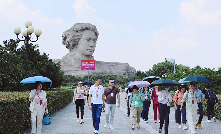 考察團(tuán)一行首先來(lái)到湖湘人文地標(biāo)橘子洲。橘子洲自古是瀟湘八景之一所在地,有著悠長(zhǎng)的自然與人文歷史源脈。如今的橘子洲,是新時(shí)代生態(tài)與文化景觀,集納自然與人文歷史精華,展示出別具特色的湖湘文化。站在毛澤東青年藝術(shù)雕塑前,感悟“恰同學(xué)少年,風(fēng)華正茂;書生意氣,揮斥方遒。指點(diǎn)江山,激揚(yáng)文字”豪情壯志。