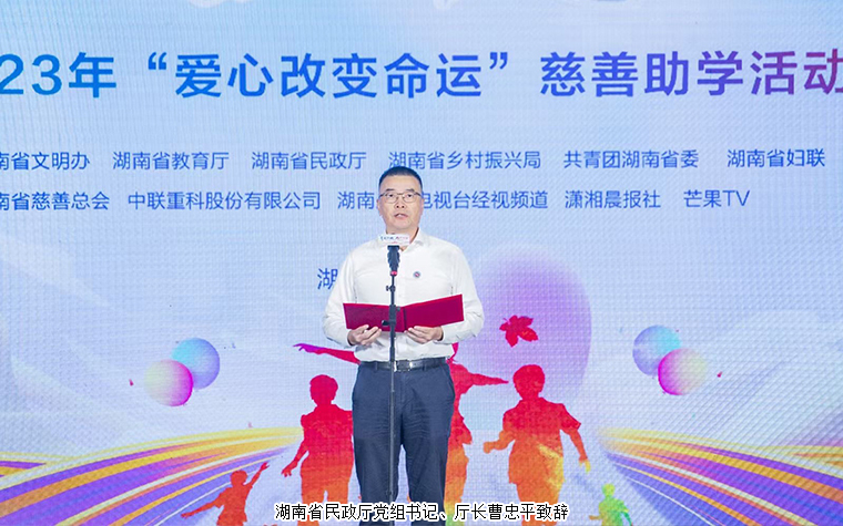活動(dòng)現(xiàn)場播放了“愛心改變命運(yùn)”2023年主題視頻以及湖南14個(gè)市州慈善會助學(xué)成果視頻。湖南省民政廳黨組書記、廳長曹忠平致辭。他在致辭中指出,慈善事業(yè)是一項(xiàng)獻(xiàn)愛心、暖人心、惠民生的崇高事業(yè)。人生之善莫過于助人,助人之德莫過于助學(xué),慈善助學(xué)是改變困境學(xué)子的希望霞光。他呼吁,社會各界攜起手來,共同加入“愛心改變命運(yùn)”慈善助學(xué)行動(dòng),用博大的愛心澆灌未來。